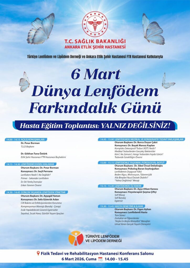 Türkiye Lenfödem ve Lipödem Derneği ile Ankara Etlik Şehir Hastanesi FTR Hastanesi katkılarıyla düzenlenen 6 Mart Dünya Lenfödem Farkındalık Günü Hasta Eğitim Toplantısı, lenfödem hakkında doğru bilgiye erişimi artırmak ve hastalara destek olmak amacıyla gerçekleştirilecektir. Toplantıda lenfödemin tanısı, tedavi yaklaşımları, günlük yaşam yönetimi, psikososyal boyut ve öz bakım konuları uzman hekimler ve sağlık profesyonelleri tarafından ele alınacaktır.